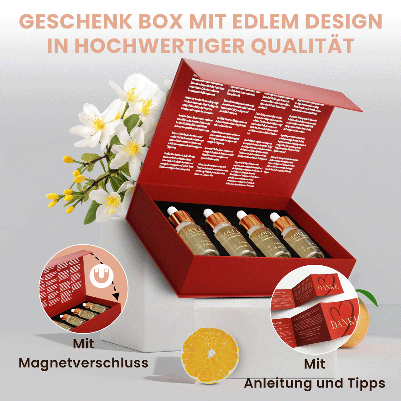 🎁 Edle 4er-Geschenkbox (je 10 ml): Hochwertige Magnetbox mit 4 exklusiven Duftölen & einer detaillierten Broschüre.